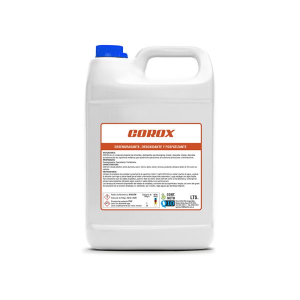 COR-OX es un compuesto especial de solventes y detergentes que desengrasa, limpia y desoxida, limpia y desoxida, acondicionando las superficies metálicas para posteriores aplicaciones de coberturas protectoras o terminaciones. COR-OX resulta efectivo sobre aluminio, acero, hierro, latón, cobre y bronce; pudiendo utilizarse tanto en frío como en caliente.